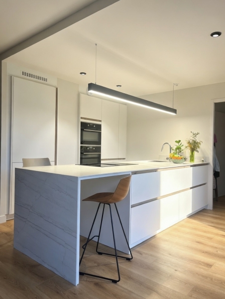Création et installation d'une cuisine haut de gamme avec un mur d'armoire séparé par une gaine technique du bâtiment. Avec un frigo grand volume (L:70cm) avec prise de main verticale. Et 3 colonnes dont une pour four et micro-ondes intégrées, et les deux autres sont des colonnes de rangements avec tiroirs intérieurs.