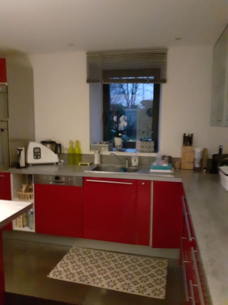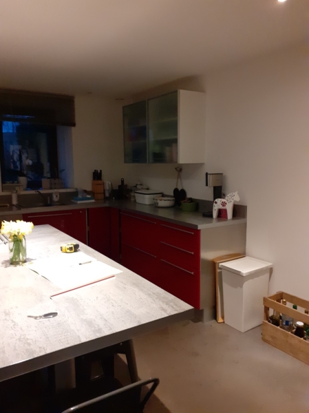 Pour ce faire il à été choisi de créer une cloison pour venir y encastrer les armoires et gagner en légèreté dans la pièce. Le reste du plan de travail disposé en "L" favorise la circulation entre les postes (lavage, préparation, cuisson).